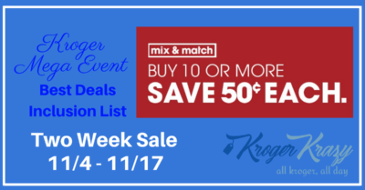 Nov 4 '20 @6:08 pm2Kroger Buy 10 or More Save $0.50 each Best Deals Inclusion List (2 week sale 11/4 – 11/17)