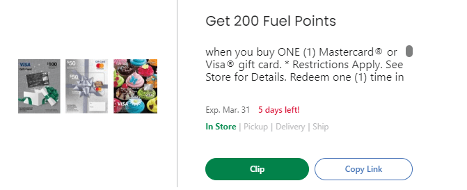 [pl-desc]Use 200 BONUS Fuel Points when you buy ONE (1) Mastercard or Visa gift card Kroger Digital Coupon – Limit 1 (exp 03/31/20)[/pl-desc]